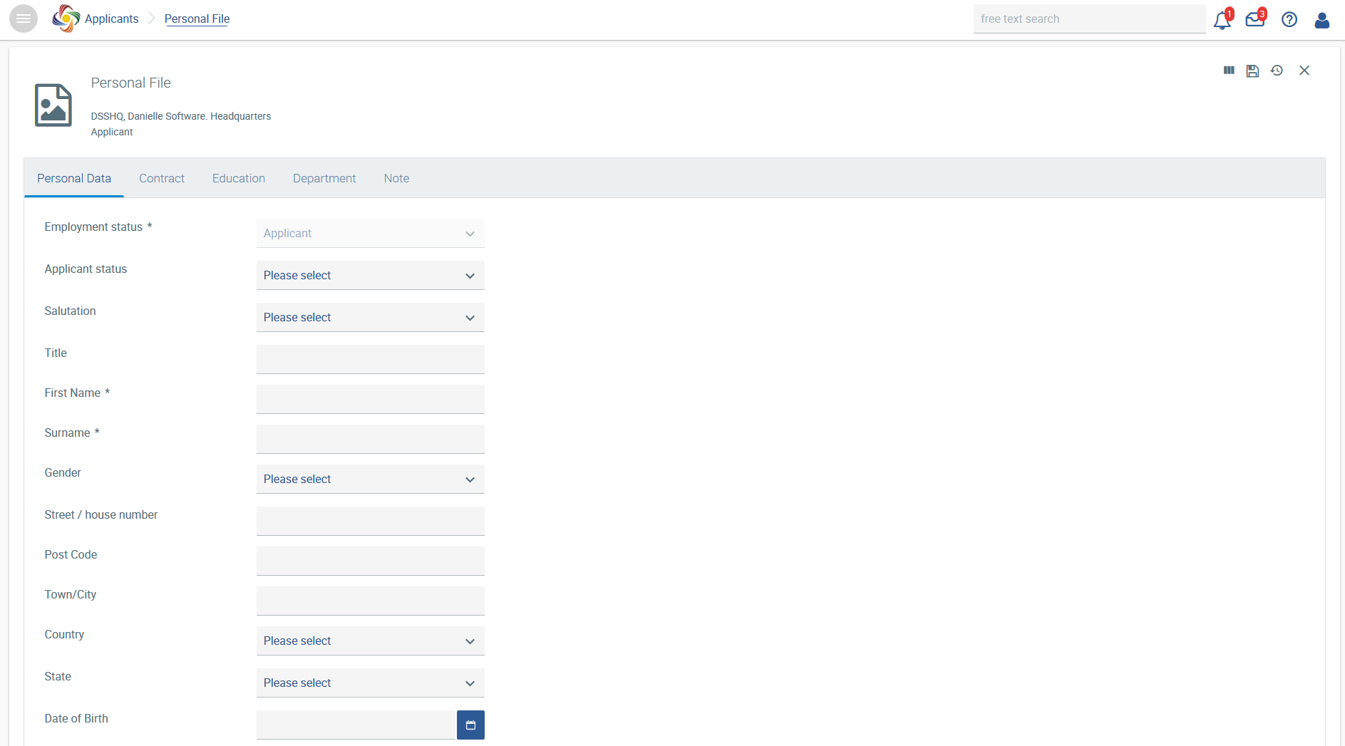 All relevant information on individual applicants is contained respectively in the electronic personnel files. Digitised documents, such as certificates and references, can be also be uploaded. The history in the personnel file is complete and continuous meaning that you can always see the time an entry is made as well as its creator. An applicant’s data are entered in the mask of the personnel file in the same way as the creation of a new employee. You can access the mask for new creations when you click on